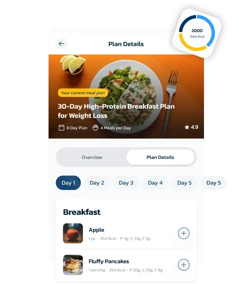 Help customers every step of the way with Meal Plans. Use dietician created meal plans, AI generated meal plans and create your own. All meal plans can adapt to the user's goals and dietary needs. If you can't eat some foods, no problem! No matter your customers food restrictions, design meal plans and recipes that perfectly match user goals. Ensure everyone enjoys a tailored, flexible, goal-oriented eating experience.